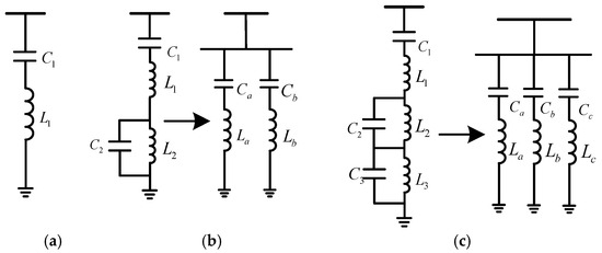 There are three types of AC filters in practical engineering, namely, single-tuned filters (ST), double-tuned filters (DT) and triple-tuned filters (TT). A double-tuned filter is equivalent to two single-tuned filters connected in parallel, and a triple-tuned filter is equivalent to three single-tuned filters connected in parallel. Regardless of the damping resistance, all three types of filters are shown in Figure 2, including the original and equivalent structures. In Figure 2, Ci and Li (i = 1, 2, 3) are the actual capacitors and actual inductors in the ac filter; Cj and Lj (j = a, b, c) are the equivalent capacitors and equivalent inductors of the ac filter. For a single-tuned filter consisting of C1 and L1, the capacitive reactive power Q0 at the resonant frequency ω1 and fundamental frequency ω0 can be calculated by the following equation [20]: