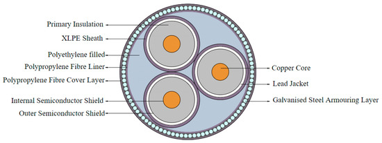 The loss factor formulae in the EC standard are based on the relationship given in (12) for tubular-type SL cables with magnetic armour layers, which applies to single-core submarine cables with sheathing and armour layers connected at both ends by fixed points. In fact, regarding the sheath loss factor λ1, there is no formula in Equation (12) specifically designed for three-core armoured submarine cables, and Equation (13) takes into account losses caused by circulating currents.
