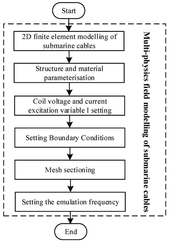 This paper uses finite element software to model the internal conductors of the cable and calculates the impedance distribution parameters of the submarine cable based on the finite element method. The specific modeling process is shown in Figure 5: Firstly, according to the material parameters provided by the submarine cable supplier and based on the submarine cable structure, a two-dimensional finite element model of three-core armoured submarine cable with multi-physical fields is established; secondly, taking into account the electromagnetic coupling between the conductors, the coil current excitation variables and terminal voltage excitation variables are set, and the boundary conditions of the submarine cable are defined; next, based on the structure of the submarine cable and the finite element model, mesh delineation is carried out, and the quality of the meshing is checked to provide the accuracy of the calculation; finally, the simulation frequency is adjusted to 50–200 Hz, and a suitable solver is selected to calculate the impedance distribution parameters of the submarine cable. The frequency of 50 Hz is selected as the lower limit in order to fully reflect the impact of frequency increase on the economic performance of the offshore AC system; 200 Hz is selected as the upper limit; through theoretical studies and calculations, it is shown that after the frequency of more than 200 Hz, the current-carrying capacity of the submarine cable is obviously reduced, and the further increase in the frequency will reduce the economic performance of the whole offshore AC system.
