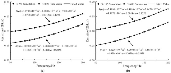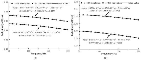 (a) Resistance fitting results of 3 × 95 and 3 × 120 sea cables. (b) Resistance fitting results of 3 × 185 and 3 × 400 sea cables. (c) Inductance fitting results for 3 × 95 and 3 × 120 type submarine cables. (d) Inductance fitting results for 3 × 185 and 3 × 400 type submarine cables.
