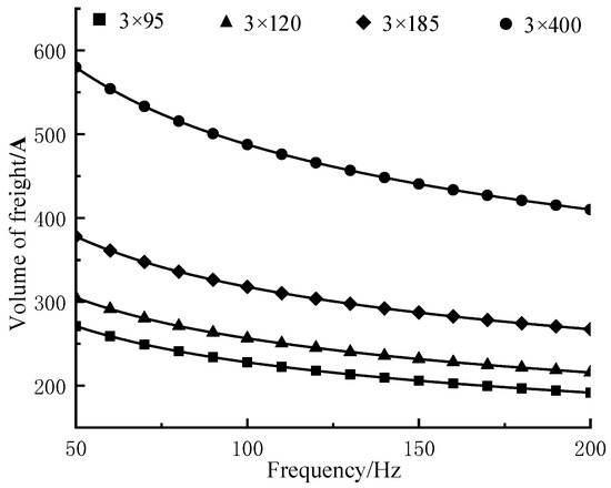 Calculations of the current carrying capacity of a typical type of submarine cable for AC grids in the frequency range of 50 to 200 Hz were carried out, and the results are shown in Figure 7.