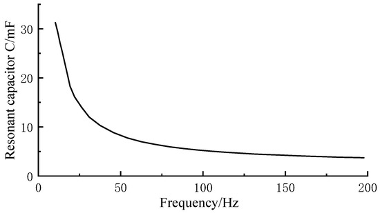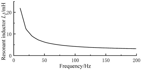 The resonant capacitance and inductance of the AC filter changed significantly when the rated operating frequency of the wind farm was increased from 50 Hz to 100 Hz. Specifically, four sets of equal-capacity double-tuned filters are used, in which the tuning times are 11.98 and 23.98, respectively. With the increase in the wind farm operating frequency, as can be seen from Figure 9, the resonant capacitance C1 of the filter decreases from the original 8.2352 μF to 5.1471 μF. As can be seen from Figure 10, the resonant inductance L1 decreases from 6.0174 mH to 4.1983 mH. Therefore, increasing the rated operating wind farm frequency not only helps to reduce the resonant capacitance and inductance of the AC filter but also effectively optimises the performance of the filter.