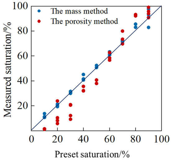 Figure 2 presents a comparison of the measured saturation values, using both methods. The results demonstrate high consistency, validating the effectiveness of both approaches. Given its simplicity and repeatability, the mass method was adopted for saturation control during sample preparation.