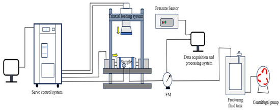 The large-scale physical simulation system used for the hydrate sediment fracturing experiment is shown in Figure 4. This system consists of four primary components: a low-temperature simulation unit, a triaxial stress loading system, a fracturing fluid injection system, and a data acquisition system. The low-temperature simulation unit maintains a stable testing environment, with a minimum controllable temperature of −10 °C, enabling experiments under hydrate-relevant thermal conditions. The triaxial stress loading system, which includes a triaxial press, hydraulic station, and control cabinet, provides independent and synchronized control of the three principal stresses, with a pressure resolution of 0.1 MPa. The fracturing fluid injection system consists of a triplex plunger pump, water tank, mass flowmeter, and high-pressure fluid pipelines. The pump can reach a maximum pressure of 100 MPa at a rated displacement of 15 L·min−1, while the piping is rated to withstand pressures up to 20 MPa, and the water tank stores the fracturing fluid, which is dyed with a red tracer for post-fracture visualization. The data acquisition system includes a signal acquisition box, pressure and flow sensors, a data transmission interface, and data acquisition software. It enables the real-time, multi-channel monitoring of parameters, such as maximum and minimum principal stresses, vertical stress, injection flow rate, and fluid pressure, with a sampling frequency of 1024 Hz.