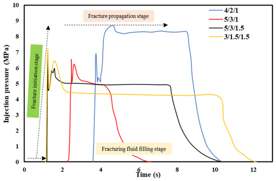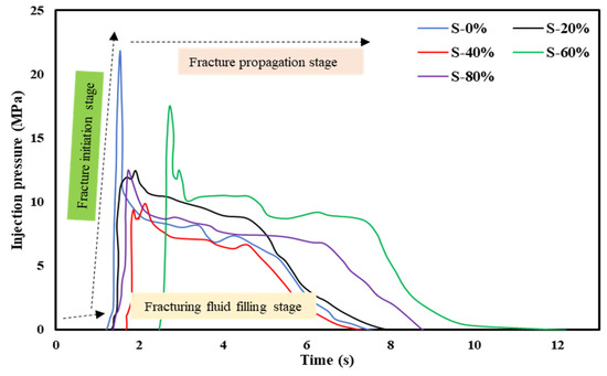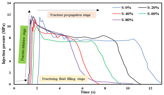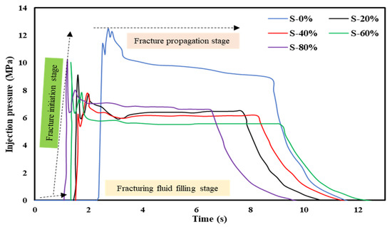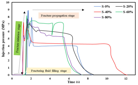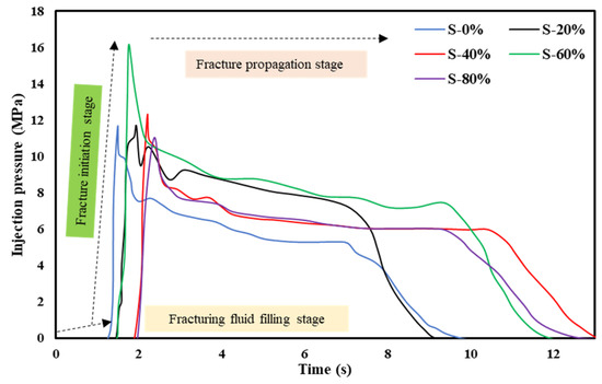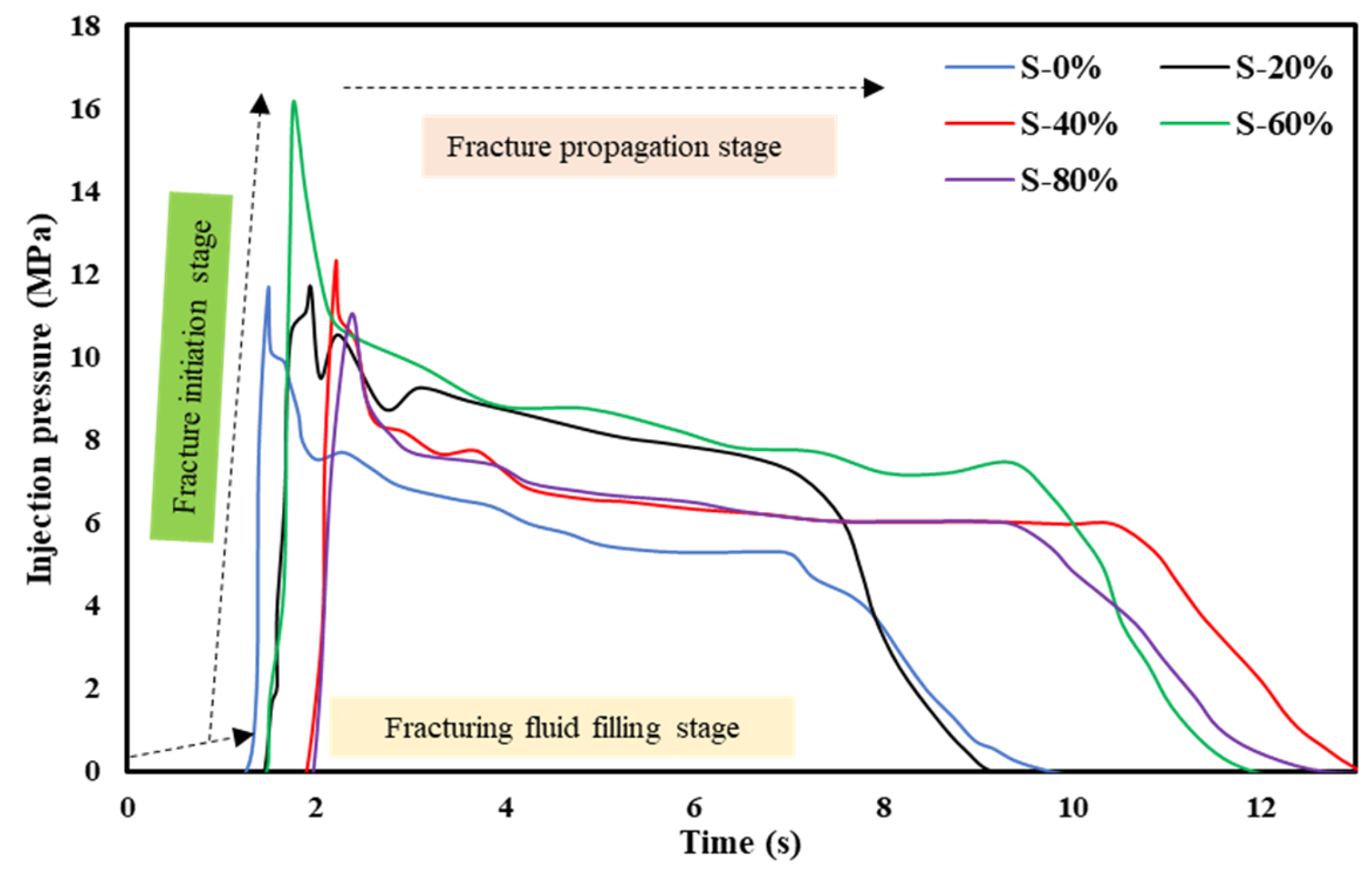 Figure 6 presents the injection pressure curves over time for samples with varying ice saturations under a fracturing fluid viscosity of 1.0 mPa·s. The fracturing curves of the samples can be broadly categorized into three stages. The first stage involves the filling of the simulated wellbore with fracturing fluid, which is pumped into the wellbore through pipelines and comes into contact with the sample at the perforation. During this stage, the injection pressure remains relatively constant. The second stage involves the initiation of fractures. As the injection rate exceeds the seepage capacity of the sample, fluid accumulation leads to a rapid increase in pressure. The increased pressure induces tangential or vertical tensile stresses around the wellbore. Once the tensile stress exceeds the tensile strength of the sample, a primary fracture is initiated, accompanied by a sudden drop in injection pressure. The third stage involves fracture propagation. Continuous fluid injection drives the expansion and propagation of fractures. In some cases, secondary fractures are generated, causing fluctuations in the pressure curve during propagation.