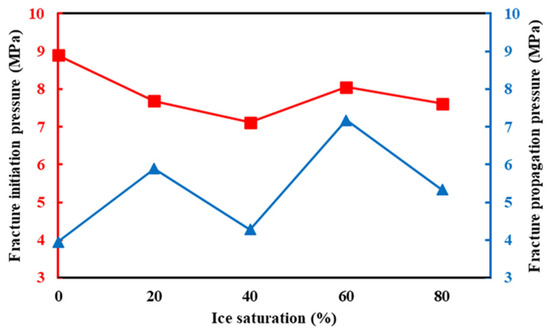 Relationship between fracture initiation and propagation pressure and ice saturation when η = 80.0 mPa·s.