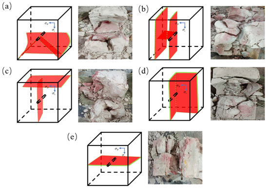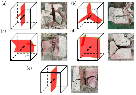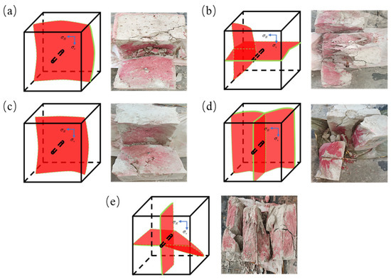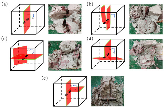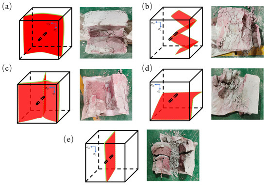 Fracture morphology of samples with different ice saturations when η = 80.0 mPa·s: (a) Sample #21 with 0% ice saturation; (b) Sample #22 with 20% ice saturation; (c) Sample #23 with 40% ice saturation; (d) Sample #24 with 60% ice saturation; and (e) Sample #25 with 80% ice saturation.