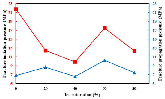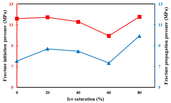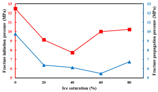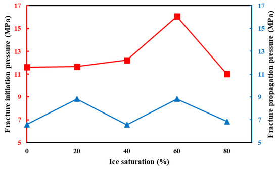 Relationship between fracture initiation and propagation pressure and ice saturation when η = 5.0 mPa·s.