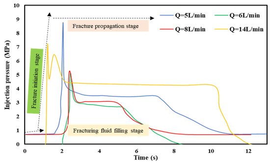 Fracturing curves of samples with different injection rates (S = 40.0%, η = 1.0 mPa·s).