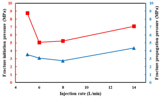 Figure 21 presents the variation in the injection pressure over time at different injection rates for a specimen with an ice saturation of 40% and a fracturing fluid viscosity of 1 mPa·s. As depicted in Figure 22, the initiation pressure and propagation pressure exhibit a trend of initially decreasing and then increasing with the increase in the fracturing fluid injection rate. At lower injection rates, the infiltration rate of the fracturing fluid into the rock sample slows down, resulting in a smaller seepage velocity gradient. In this scenario, a higher total pressure is required to initiate fractures within the specimen. Additionally, the fluid loss from the fracturing fluid enhances the pore pressure, while the fracture propagation rate is insufficient to release the fluid pressure within the fractures. Consequently, higher initiation and propagation pressures are observed during the fracturing tests conducted at low injection rates.