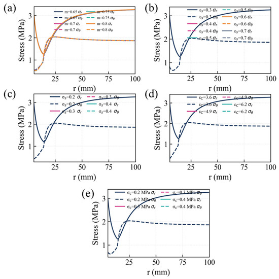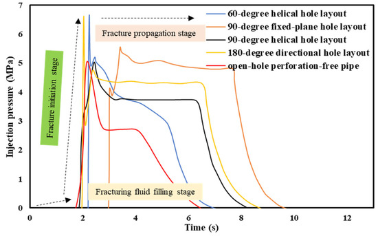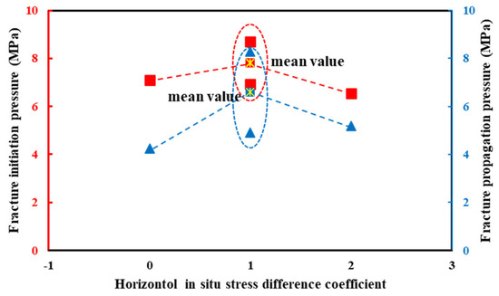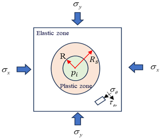 For horizontal wells, the initiation pressure pf of the elastic wellbore can be obtained through a precise mechanical analysis and calculation, as shown in Equation (12). The plastic wellbore initiation pressure pf can be calculated using Equation (13).