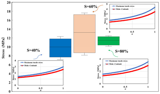 Mohr’s circles were constructed based on the experimental results of the samples with the same ice saturation under confining pressures of 0 MPa, 1 MPa, and 2 MPa, as shown in Figure A3. Specifically, Mohr’s circles for cores with ice saturations of 20%, 40%, 60%, and 80% were plotted separately. Subsequently, the cohesion and internal friction angles of cores with varying ice saturations were calculated using the Mohr–Coulomb strength criterion.