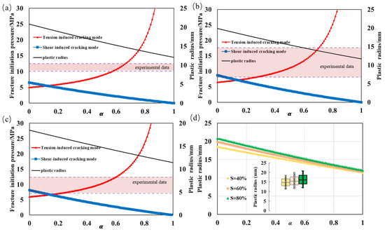 The variation in the initiation pressure with the effective stress coefficient under different fracture initiation modes: (a) S = 40%, (b) S = 60%, (c) S = 80%, and (d) plastic radius at different saturation levels.