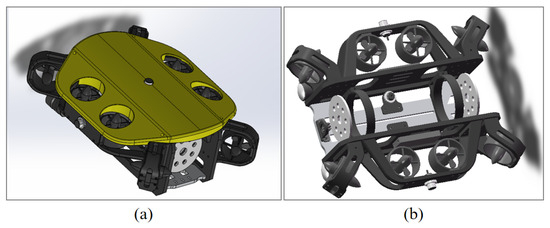 The overall 3D model of the AUV is shown in Figure 2a. The structure of the entire underwater robot is made of HDPE material, with a hydrodynamic outer shell fabricated using photosensitive resin through 3D printing, and the sealed cabin is constructed from acrylic material. The outer shell primarily serves to protect the internal components of the underwater robot from the impact of ocean currents and debris, while also providing a streamlined shape that enhances hydrodynamic performance, reduces fluid resistance during operation, and thereby lowers power consumption.