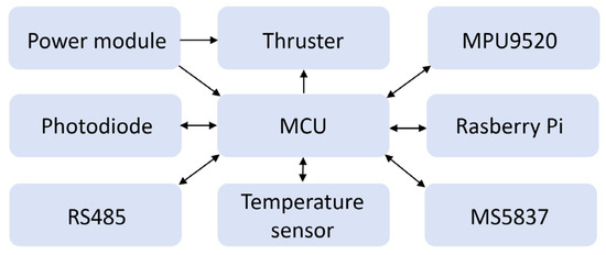 The hardware of the underwater robot uses STM32F411 as the main control unit. An MPU9250 nine-axis gyroscope is employed to continuously acquire attitude data for controlling the robot’s orientation, while an MS5837 pressure sensor is used to obtain depth information, enabling precise control of the robot’s diving depth. The MCU must reserve I2C interfaces to communicate with both MPU9250 and MS5837. A Raspberry Pi is used for executing complex algorithms and computational tasks, communicating with the MCU via a TTL serial interface. The overall system structure is shown in Figure 4.