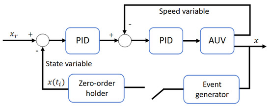 The structural model of the control system based on the event-triggered cascade PID (ET-CPID) algorithm studied in this section is shown in Figure 8. In this system, a PID controller is used to adjust the AUV’s control inputs, ensuring that the system follows the desired trajectory or velocity according to the given target. Within this control system, the state variable x(ti) and the reference value xr interact with the PID controller through a feedback loop. The change in velocity is used as part of the control input, which directly influences the motion of the AUV. The system also incorporates an event-triggered mechanism, which monitors changes in the system state in real time based on predefined trigger conditions. This mechanism evaluates the feedback state variable information to determine whether the trigger condition is satisfied, thereby deciding whether to update the control output.