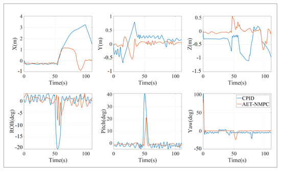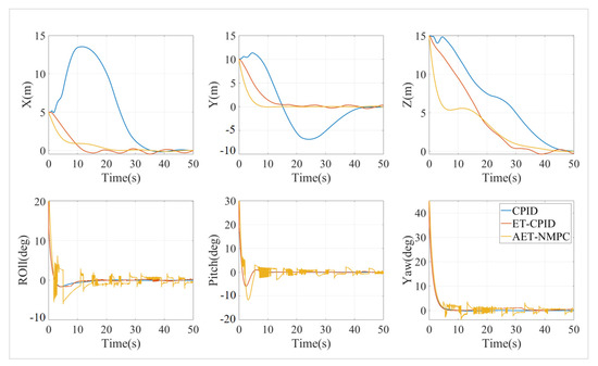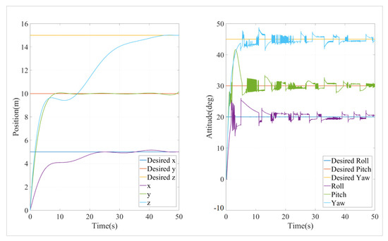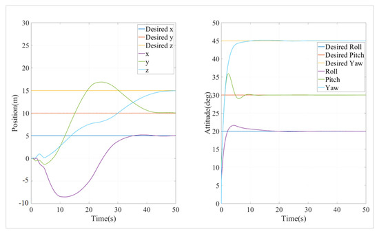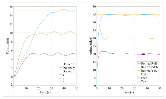 The simulation was conducted using an event-triggered cascade PID (ET-CPID) algorithm, with the trigger conditions set to elim = 0.1 and Tmax = 10. The position and attitude simulation results are shown in Figure 10 and Figure 11.