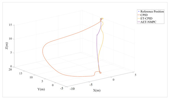 In this part of this study, we carried out a test to evaluate the AUV’s ability to move from an initial position (0, 0, 0) to a target (5 m, 10 m, 15 m) while maintaining fixed attitude angles (roll = 20°, pitch = 30°, yaw = 45°). The goal is to assess positioning accuracy and attitude stability under different control strategies (CPID, ET-CPID, AET-NMPC). The test parameters and results are shown in Table 6.
