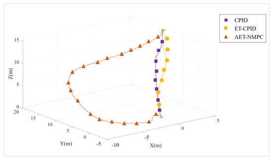 In the point-to-point tracking task, the AET-NMPC algorithm performed the best, with a dimensionless error value of 4.89%. In comparison, the ET-CPID had an error of 5.76%, while the CPID showed an error of 15.70%. In terms of error, AET-NMPC outperformed ET-CPID by 0.87 percentage points and surpassed CPID by 10.81 percentage points. These results indicate that AET-NMPC offers superior path tracking accuracy in point-to-point tasks. AET-NMPC could accurately predict the future trajectory and dynamically adjust control parameters based on the error, significantly reducing deviations. Leveraging its model predictive capabilities, AET-NMPC responded more rapidly to path changes, achieving higher precision. Although ET-CPID’s error was slightly higher than that of AET-NMPC, it still demonstrated adequate performance in simple point-to-point tasks. However, it lacks the precise path adjustment capabilities of AET-NMPC. The CPID algorithm exhibited significantly larger errors, indicating that it is less effective at handling dynamic changes during control in point-to-point tasks, which leads to accumulating deviations.