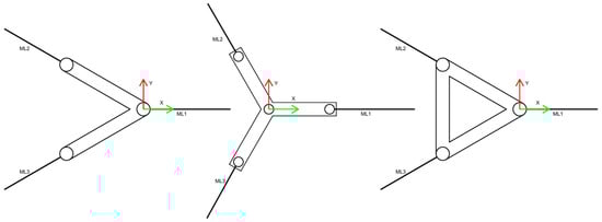 The NewSemi floater, an enhancement of the V-shaped concept, is a semi-submersible offshore wind turbine platform. It comprises three columns and two pontoons. The pontoons connect the side columns to the central column, forming a V-shaped structure. Some studies have shown that the natural frequency of the V-shaped floater in the pitch direction is too high, which interferes with the main wave energy zone under extreme sea conditions. This presents challenges for the floater’s application in the South China Sea, where typhoons are frequent and sea conditions are harsh. Recognizing the limitations of the V-shaped design, a new concept has been proposed. As shown in Figure 1, the novel NewSemi concept builds upon the V-shaped design by adding an additional pontoon, thereby improving the hydrodynamic performance of the floater. The parameters of the NewSemi platform, the V-shaped [] and Braceless [] reference platforms are shown in Table 1. The target water depth for the three floating wind turbine platforms is 95 m, and Table 2 provides mooring parameter information for the three platforms. It must be noted that the mooring layout and parameters of NewSemi and V-shaped are the same, while the mooring parameters of Braceless are different. The mooring parameter information of V-shaped and Braceless both refer to the research of Luan et al. [] and Karimirad et al. []. We defined three mooring arrangements for the platform, as shown in Figure 2.