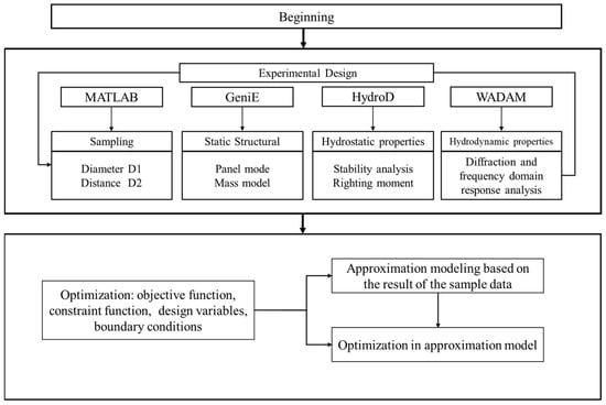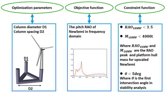 The upscaling optimization process is illustrated in Figure 3. The optimization parameter information is showed in Figure 4. This process can be divided into two parts: the sample preparation process and the optimization process. The optimal Latin-hypercube design method was used to select the diameter and distance of the floater as the test factors, as this method distributes all sample points uniformly in the design space, providing good space filling []. We set the lower limit of the column diameter D1 to 11 m and the upper limit to 14 m. The number of sampling points is 30 and the sequence is divided into equal parts; we set the lower limit of the column distance D2 to 70 m and the upper limit to 90 m. Similarly, the number and distribution of sampling points for D2 remain the same as D1. GeniE is used to model the floater and generate the panel and structural models after sampling, which is a widely used pre-processing software developed by Det Norske Veritas for the shipbuilding and marine engineering industry. Subsequently, the stability analysis of the floater is conducted in HydroD []. In this study, the righting moment at a heel angle of 5 degrees was selected as the stability function, as we want the first intersection angle of stability for the new floater to be of less than 5 degrees. The hydrodynamic analysis is carried out in WADAM, focusing on the significant values of pitch and heave response spectra of floater motion under extreme sea conditions. Due to the significant inhibitory effect of aerodynamic damping on heave, pitch, and nacelle motion of the semi-submersible floating wind turbine floater, the floater’s motion response under moderate sea conditions is primarily influenced by wind loads []. Therefore, the floater’s motion response under extreme sea conditions has been selected as the optimization variable.