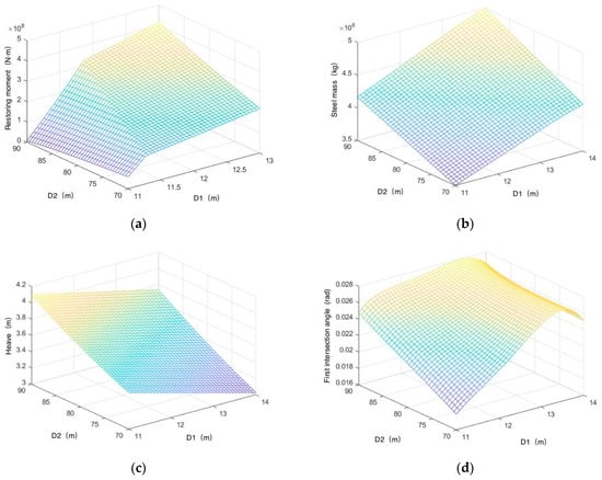In the optimization, the column diameter D1 and distance D2 served as the optimization parameters. The optimization process utilized the differential evolution (DE) algorithm, with the objective function being the significant motion response in pitch direction of the floater under extreme sea conditions. In addition to the boundary conditions, there are three constraints: the significant heave response should be of less than 3.5 m, the steel mass of the platform hull should be of less than 4000 t, and the first intersection angle between the heeling moment curve and the righting moment curve should be of less than 5 degrees. Figure 5 shows the sensitivity analysis of the correlation between optimization factors and constraint conditions.