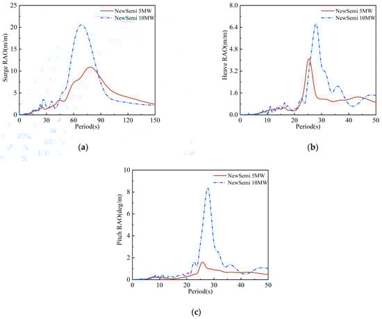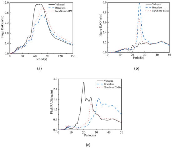 Comparison of the motion RAOs of the three 5 MW FOWTs: (a) surge RAO; (b) heave RAO; (c) pitch RAO.