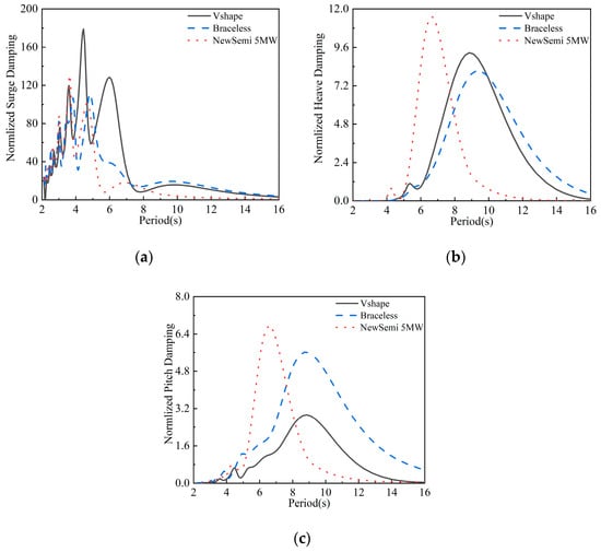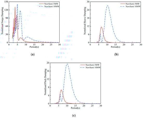 Comparison of the radiation damping of the three FOWTs: (a) normalized surge damping; (b) normalized heave damping; (c) normalized pitch damping.