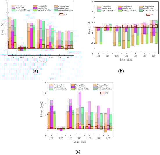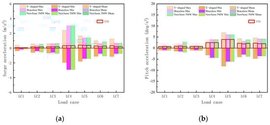 The motion statistics in the time domain provide a more direct demonstration on the hydrodynamic performance under real ocean conditions. Figure 8 presents the statistical results of the motion responses for the three FOWTs under specified environmental conditions. Figure 9 shows the statistical results of the nacelle acceleration of three FOWTs. The average motion values in the surge and pitch directions are similar for the V-shaped and NewSemi FOWTs, with both being smaller than those of the Braceless FOWT. Under extreme environmental condition (LC7), the average motion response of the NewSemi FOWT in these two directions is reduced by 14.6% and 65.2%, respectively. In terms of nacelle acceleration in the surge direction, the NewSemi’s results under the influence of high wind speed sea state LC5 decreased by 16% compared to V-shaped’s results, while the NewSemi’s results under extreme sea state LC7 were only 54.6% of V-shaped’s results. In the pitch direction, the acceleration also decreased variously in extreme conditions. Additionally, the standard deviation (STD) of the NewSemi FOWT for each operating condition is smaller than that of the V-shaped FOWT. Under extreme environmental conditions (LC7), the STD of the NewSemi FOWT is reduced by 11.3% and 31.9%, respectively. This demonstrates that the NewSemi FOWT exhibits good stability in the surge and pitch directions, maintaining balance in various environments. However, in the heave direction, the Braceless FOWT has better mean and standard deviation values compared to the other two FOWTs. The smaller surge response can effectively reduce the possibility of fatigue failure caused by excessive longitudinal motion, and the optimization in the pitch direction meets the goal of this study.