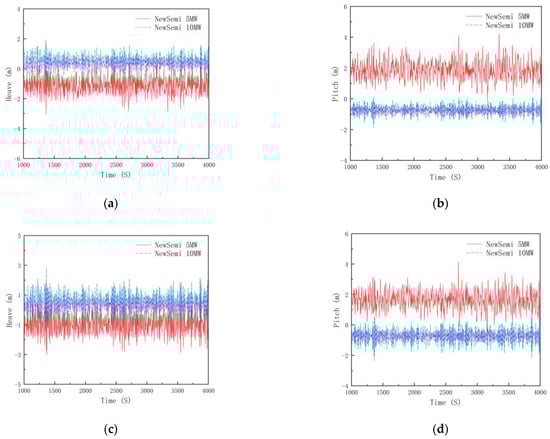 From Figure 6c, it can be observed that all three FOWTs exhibit three peaks in the pitch motion response RAO, corresponding to the natural periods of pitch motion, surge motion, and the peak frequency of the wave excitation force. Additionally, the pitch RAO for the NewSemi FOWT is noticeably better, with the lowest peak compared to the V-shaped and Braceless FOWTs. Furthermore, the NewSemi FOWT effectively addressed the issue of interacting with the main wave energy zone under extreme sea conditions, which is a challenge for the V-shape FOWT.