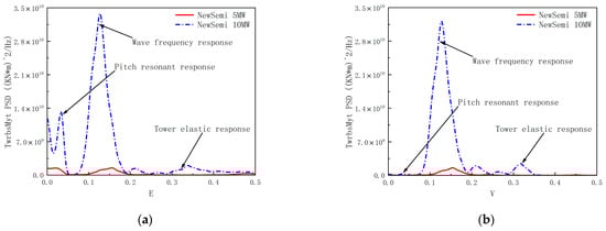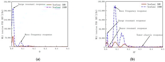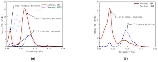 For single-degree-of-freedom resonant load response, the steady-state response at the natural period depends on the static displacement and dynamic amplification factor. The static displacement is influenced by the first-order wave force and restoring stiffness, while the dynamic amplification factor is determined by the damping. At low frequencies, the floater’s potential flow damping is nearly zero, and the numerical model’s damping mainly comes from the Morrison equation’s quadratic damping term, an empirical calculation method. However, wave-induced low-frequency excitation is minimal and does not cause resonance. The floater’s motion response under isolated wave action remains quasi-static, with response energy concentrated at the wave peak frequency. Within the main wave frequency range (3–20 s), the three FOWTs’ comparison shows that, compared to the V-shaped FOWT, the NewSemi FOWT has a significant advantage in this frequency range, similar to the Braceless FOWT.