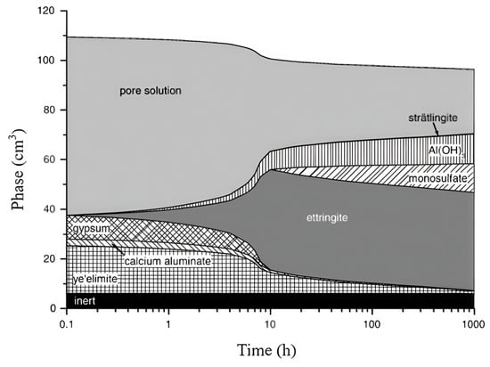 The hydration kinetics and products of ye’elimite are influenced by the addition of calcium sulfate or calcium hydroxide. Ye’elimite reacts according to Equation (2) to form monosulfate and aluminum hydroxide when mixed with fresh water, the latter typically being X-ray amorphous. The kinetics of this reaction are quite slow, which exhibits a dormant period of several hours. The addition of gypsum or anhydrite accelerates the hydration kinetics, leading to the formation of ettringite along with aluminum hydroxide instead of monosulfate as per Equation (4). When calcium sulfate is consumed, monosulfate forms according to Equation (2). The ratio between ye’elimite and calcium sulfate determines the proportion of ettringite to monosulfate in the final product. When the molar ratio of calcium sulfate to ye’elimite is greater than 2, only the reaction shown in Equation (4) occurs. Compared to OPC cement, CSA-based cements react more rapidly, and most of the hydration heat release occurs between 2 to 24 h after hydration. The typical value of hydration heat measured by conduction calorimetry approaches 400 J/g after 72 h []. Figure 1 shows the phase development of a CSA cement (water/cement = 0.80) as a function of hydration time calculated by thermodynamic modeling [].