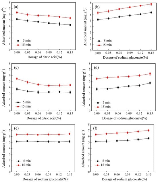 Effects of retarders on the PC adsorption amount of the cement pastes []. (a) BNS + CA, (b) BNS + SG, (c) AS + CA, (d) AS + SG, (e) PC + CA, (f) PC + SG.