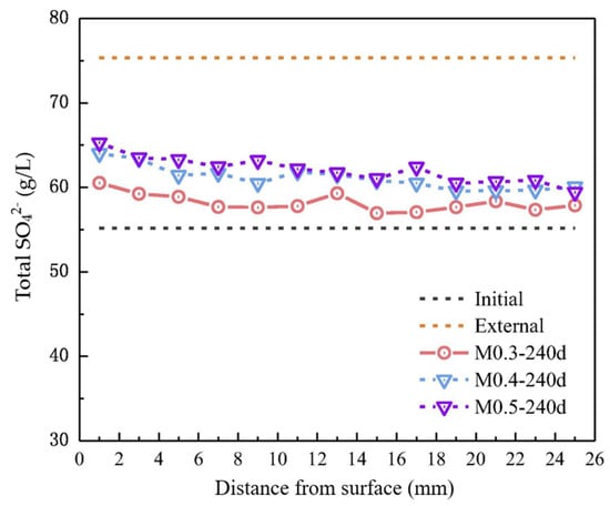 CSA cement has outstanding sulfate resistance because no chemical interaction between hydration products and sulfates takes place. It is reported a significant amount of sulfate ions penetrated the specimens after 240 days of immersion, yet no sulfate damage was observed. However, the diffusion coefficient of sulfate ions in CSA mortar is similar to that in OPC cement mortar. Hence, it can be summarized that the enhanced sulfate resistance of CSA cement is not responsible for low permeability, but rather for the no chemical reaction between the hydration products and sulfate ions, and no expansive products are formed []. The initial concentration of sulfate ion in the mortar specimens and the sulfate ion concentration in the external solution are shown in the dotted line of Figure 3.