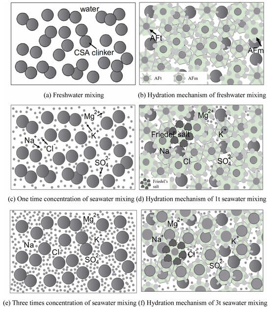 The presence of seawater can accelerate the hydration process. It is demonstrated that SO42− can promote the formation of AFt formation. Subsequently, in the later stages of the hydration process, AFt transforms into AFm. Additionally, AFm interacts positively with Cl−, resulting in the formation of Friedel’s salt which is beneficial for pore filling. On the contrary, high seawater concentration have disadvantages, as the rapid formation of AFt hinders the hydration of CSA cement, thereby impeding the Mechanical properties development. Figure 4 illustrates the hydration mechanism of the CSA cement when mixed with freshwater, normal concentration seawater, and high concentration seawater [].