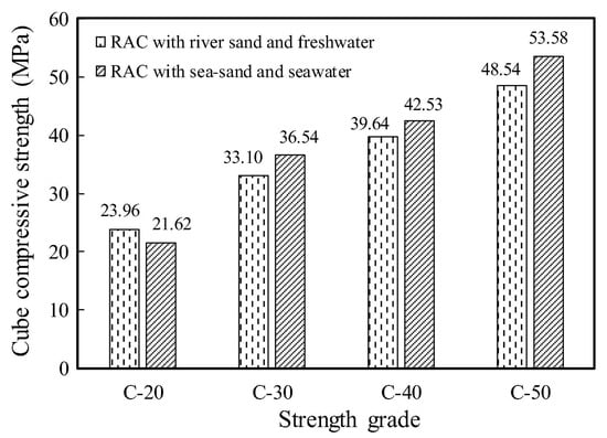 CSA cement exhibits excellent mechanical properties mixed with seawater. Most studies indicate that the 7-day compressive strength of concrete prepared with sea sand and/or seawater is significantly higher than ordinary concrete, while the 28-day compressive strength is comparable to ordinary concrete. The long-term compressive strength is also similar to ordinary concrete []. Figure 5. shows the result of a 28-day strength comparison between ordinary recycled aggregate concrete (RAC) and RAC with sea sand and seawater.