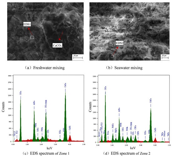 The salts in seawater can react with CSA, resulting in the improvement of mechanical properties. It is communicated some of the salts brought in by seawater form crystals and react with CSA cement hydration products like AFm, CSH gel, and calcium hydroxide. Overall, the growth of AFt and gel in CSA cement with seawater incorporation is denser, which can enhance the compactness and mechanical strength of the structure []. Figure 6 shows the micromorphology of hydration products and corresponding EDS spectrum of the CSA cement paste when mixed with freshwater and seawater for 28 d.