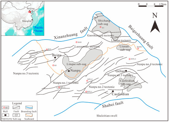 Nanpu sag is located in the northern part of Huanghua sag (Figure 1), with an area of 1932 km2, spanning over sea and land, including 540 km2 of land part and 260 km2 of marine–continental transitional zone, which is a land-phase fracture basin developed on the base of North China plateau through the block fracture movement of the Middle and Cenozoic Era. The area is bounded by the Xinanzhuang deep fracture, Laowangzhuang bulge, and Xinanzhuang bulge to the north; the Baigezhuang deep fracture (adjacent to Baigezhuang bulge, Matouying bulge, and Shishuituo bulge) to the east; the Shaleitian bulge to the south; and the Beitang sag to the west. The Nanpu sag is characterized by the development of different levels and contemporaneous fractures, and the complex fracture system formed by the fractures and the fracture blocks they divide is the main feature of the Nanpu sag. Fractures mostly extend in the NNE and near-EW directions; based on scale and function, they are classified as first-order “concave-control” fractures, second-order “belt-control” fractures, and third- to fourth-order faults. The concave-controlled fractures are mainly homogenous boundary fractures, including the Baigezhuang fracture, the Xinanzhuang fracture, the Shabei fracture, and the Gaoliu fracture. The Nanpu sag has a maximum thickness of 8000 m of Paleocene sedimentary rocks and consists of strata of the Paleocene Shahejie Fm, Dongying Fm, and the Neocene Minghuazhen Fm and Guantao Fm. Among them, the stratum of Shahejie Fm is divided into the third-first member of the Shahejie Fm from bottom to top; Dongying Fm can also be divided into the third-first member of the Dongying Fm from bottom to top. Compared with other sags in the Bohai Bay Basin, the Nanpu sag has many similarities and obvious differences. The sedimentary stratum of the Dongying Fm is relatively thicker than that of other sags, but it lacks the sedimentary stratum of the fourth member of the Shahejie Fm.
