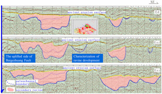 Incised valleys, typically located on lake basin margins or above lake shorelines, form due to rapid declines in datum level, triggering riverbed undercutting along or independently of faulted troughs or regulating zones [57]. These valleys act as conduits for transporting large volumes of detritus into the basins. Combined with deep-source seismic profiles in the study area [58], four gullies can be identified on the Baigezhuang Fault, and two secondary gullies can be identified in the large gully in the northwest section of the Baigezhuang fault (Figure 2). From the distribution of incised valleys on the stripped surface of the present fault, the Paleocene sand in the Nanpu sag is strongly inherited vertically and controlled by the development of incised valleys horizontally.