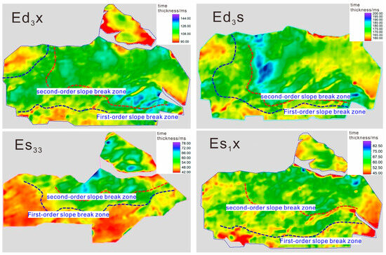 Under the influence of tectonic activities, the Nanpu sag developed several slope break zones related to sedimentation during the Paleoproterozoic depositional period, which have responses in the time thickness of the third-order stratigraphic sequence (Figure 3). Analysis of the third-order stratigraphic time thickness map in Nanpu sag shows that there are two obvious slope break zones—the first-order and second-order slope break zones—exhibiting markedly different developmental characteristics across secondary stratigraphic periods.