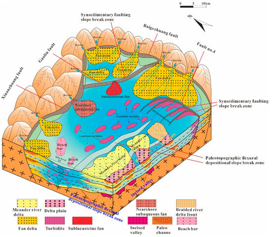 Faulted troughs are the most common type of basin margin valleys [55]. They form either as intersecting structures between two sag-controlling faults with differing strike directions or as grabens created by faults oblique to the sag-controlling faults [56]. These troughs serve as both the entry points for the sag basin’s water system into the lake and the primary zones for developing various sandstone-conglomerate fans.