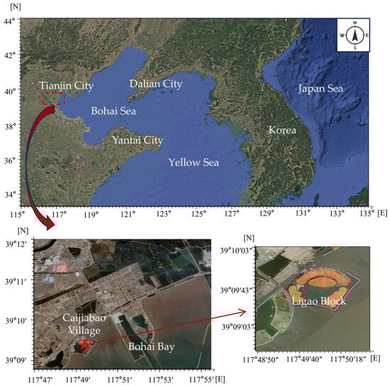 To investigate approaches for enhancing seawater exchange capacity in enclosed marine areas and improving common ecological environmental issues currently observed in these regions, this study focuses on a typical enclosed coastal water body located within the Ligao Block in Tianjin. The Ligao Block is situated in the tidal flat area of Caijiabao Village, Tianjin, and falls within the designated planning area of the coastal tourism zone. It is bounded by the Central Fishing Port to the east, the outer embankment of the Binhai Aircraft Carrier Theme Park to the west, and the Coastal Expressway to the north, forming a visual corridor aligned with the Mazu Statue in the coastal tourism zone (Figure 1).