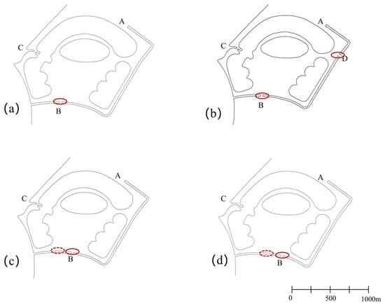 In Figure 2: (1) Scheme 1 sets two gates on the outer embankment at points A and C, with one additional gate at the west side (Point B) (Figure 2a). (2) Scheme 2 adds a gate at the east embankment (Point D) based on Scheme 1, keeping all other gate parameters unchanged (Figure 2b). (3) Schemes 3, 5, and 6 relocate the gate at Point B 100 m eastward to the midpoint of the southern embankment; other gate parameters remain as in Scheme 1 (Figure 2c). (4) Scheme 4 further shifts the gate at Point B an additional 100 m eastward compared to Scheme 3, with other parameters consistent with Scheme 3 (Figure 2d).