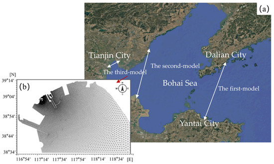 The hydrodynamic model in this study adopts a three-level nested grid approach, covering the Bohai Sea, Bohai Bay, and the project area. Figure 3 illustrates the domains of the three models and the mesh configuration of the third model.