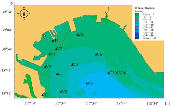 The computational domain of the third model encompasses the sea area adjacent to Tianjin City, forming a north–south oriented rectangular area measuring 46 km × 30 km. The model uses triangular unstructured grid mesh for spatial discretization in the project area (Figure 3b). A total of 35,425 computational elements and 18,644 nodes are generated, with a minimum grid resolution of 10 m in the project area, while the maximum grid resolution reaches 2000 m in the open sea region with relatively smooth bathymetric gradients to improve computational efficiency.
