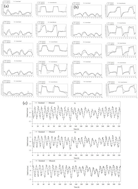 The validation curves of the model: (a) current speed and direction during the spring tide period at stations v1–v5; (b) current speed and direction during the neap tide period at stations v6–v10; and (c) tide level verification curve.