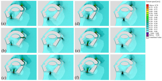 Flow field diagrams after the implementation of gate reconstruction: (a) Scheme 1; (b) Scheme 2; (c) Scheme 3; (d) Scheme 4; (e) Scheme 5; and (f) Scheme 6.