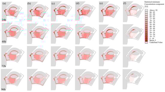 The spatial distributions of water exchange rates: (a) Scheme 1; (b) Scheme 2; (c) Scheme 3; (d) Scheme 4; (e) Scheme 5; (f) Scheme 6.