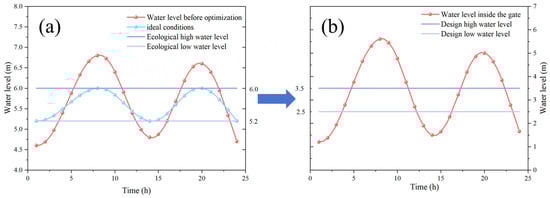 In Figure 9, the left figure shows the external water level of the block. The red curve indicates the average water level trend within the basin before optimization, exhibiting significant fluctuations. The blue curve represents the water level trend within the enclosed basin under ideal conditions that meet ecological water level requirements. The upper and lower horizontal lavender lines denote the maximum and minimum water levels specified by environmental standards, respectively. The right figure shows the internal water level at the gate. The red curve illustrates the water level variation inside the gate. The upper and lower horizontal purple lines indicate the gate regulation range, derived from the BP neural network model optimized based on the nonlinear mapping relationship and the calculated ecological water level requirements.