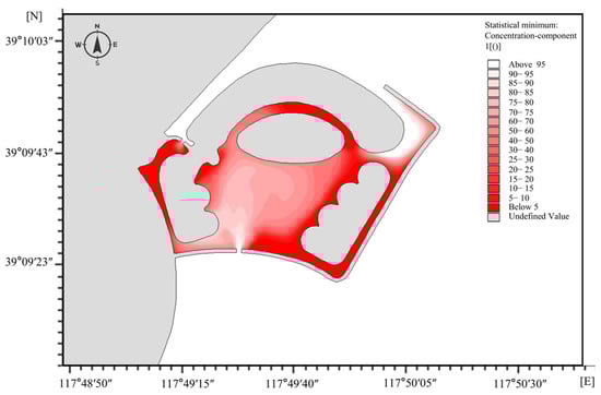 - Based on the convection–diffusion pollutant transport model, in this study, the initial concentration is assumed to be inferior to the external water in the outer seawall of the enclosed sea area, and there is no external load near this water area. The distribution is based on an external concentration of 0.5 units and an internal concentration of 1 unit. The shore and vertical boundaries adopt no flux conditions, and the open boundary is selected as inflow and outflow with no gradient conditions. The water quality model and the hydrodynamic model use the same set of computational grids.